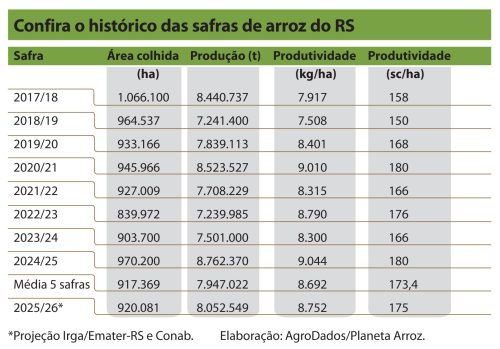 Para Eduardo Bonotto, presidente do Irga, “a redução de área é uma resposta racional do produtor, que avalia custo, risco e preço com base em dados técnicos. Mesmo com margens curtas, o Rio Grande do Sul segue como referência e deve responder por cerca de 70% da produção nacional”. Luis Fernando Siqueira, engenheiro agrônomo do Irga, entende que o nível tecnológico das lavouras gaúchas é altíssimo, mas reconhece que as dificuldades de acesso ao crédito pelos produtores podem interferir negativamente nas práticas recomendadas de manejo e, em especial, na aquisição dos insumos necessários para buscar resultados sustentáveis.