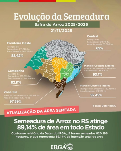 (Por Irga) O Rio Grande do Sul já conta com 820.196 hectares semeados em todas as regiões arrozeiras, o que representa 89,14% da intenção total.