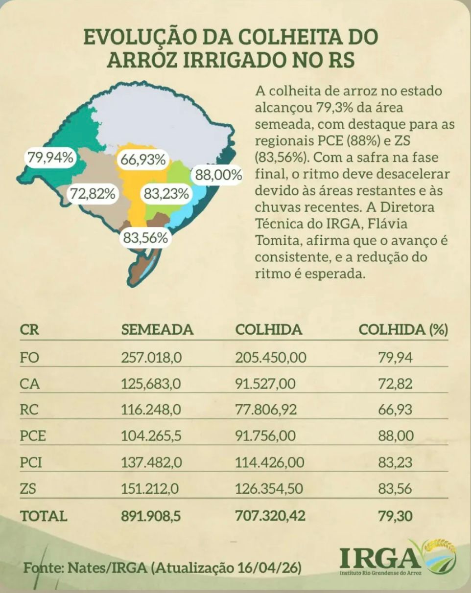 (Por Irga) A colheita de arroz 2025/26 no Rio Grande do Sul alcançou 79,3% da área semeada nesta temporada até a quarta-feira, dia 13 de abril, mantendo um bom desempenho geral, embora prossiga com relativo atraso em relação à safra passada e à média das operações anuais. Os dados foram divulgados nesta quinta-feira (16/4) pelo Instituto Rio Grandense do Arroz (Irga).