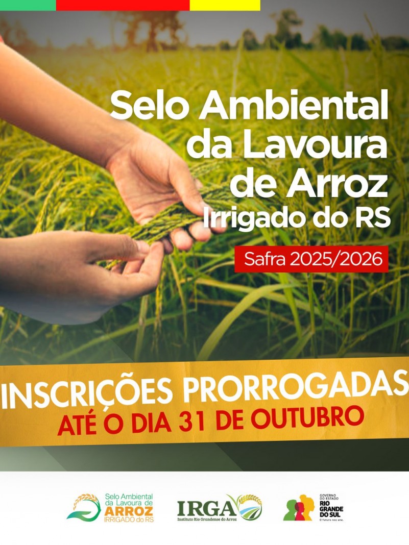 (Por Irga) O Instituto Rio Grandense do Arroz (Irga) informa que o prazo de inscrição para o Selo Ambiental do Arroz do Rio Grande do Sul – Safra 2025/2026 foi prorrogado até o dia 31 de outubro de 2025. A medida busca oferecer mais tempo para que os produtores interessados possam reunir a documentação necessária e formalizar sua participação no programa.