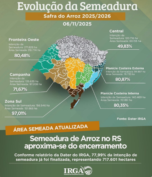 As informações do Instituto Rio Grandense do Arroz (Irga) apontam a Região da Zona Sul, como a mais próxima de encerrar a semeadura, com 97,01% já realizada, ou seja, 151.868 hectares.